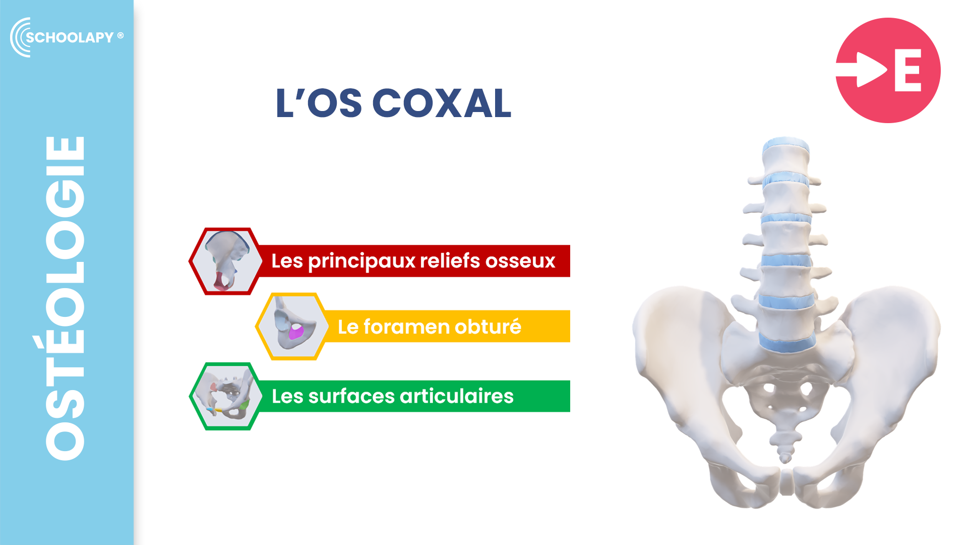 Les Essentiels : Les principaux reliefs osseux, le foramen obturé, les surfaces articulaires